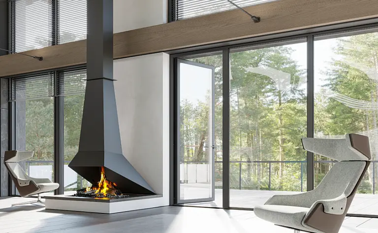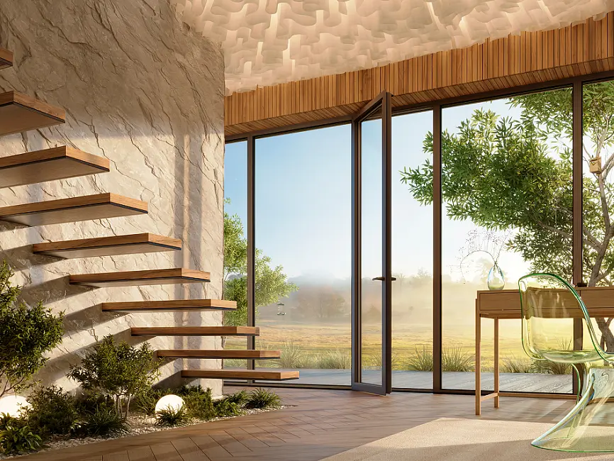 Решение для тех, кто не хочет загромождать свободное место на террасе. Дверь с открывание внутрь оставит максимум пространства для обустройства комфортной зоны отдыха.